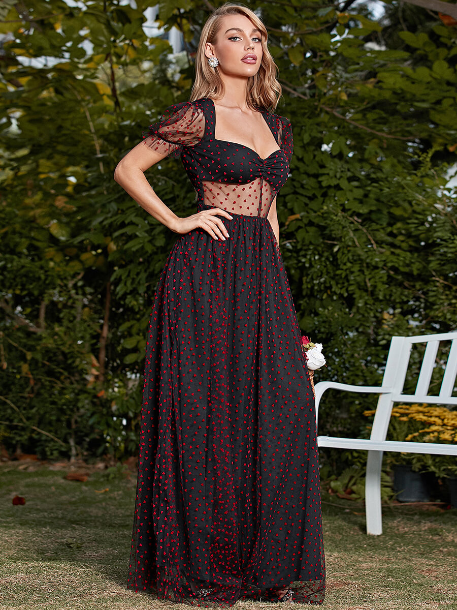 Printed Spliced Mesh Zip-Back Maxi Dress
