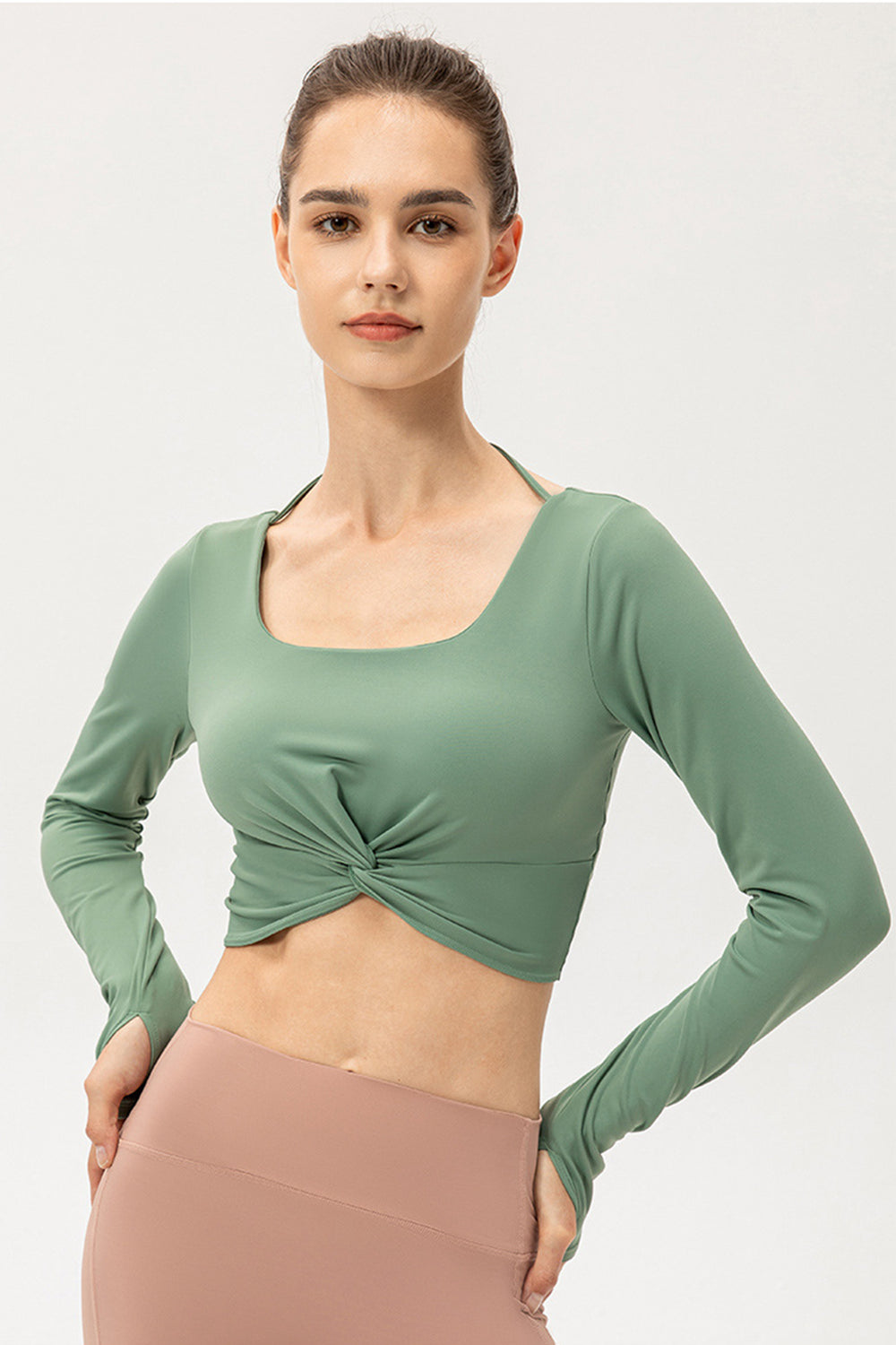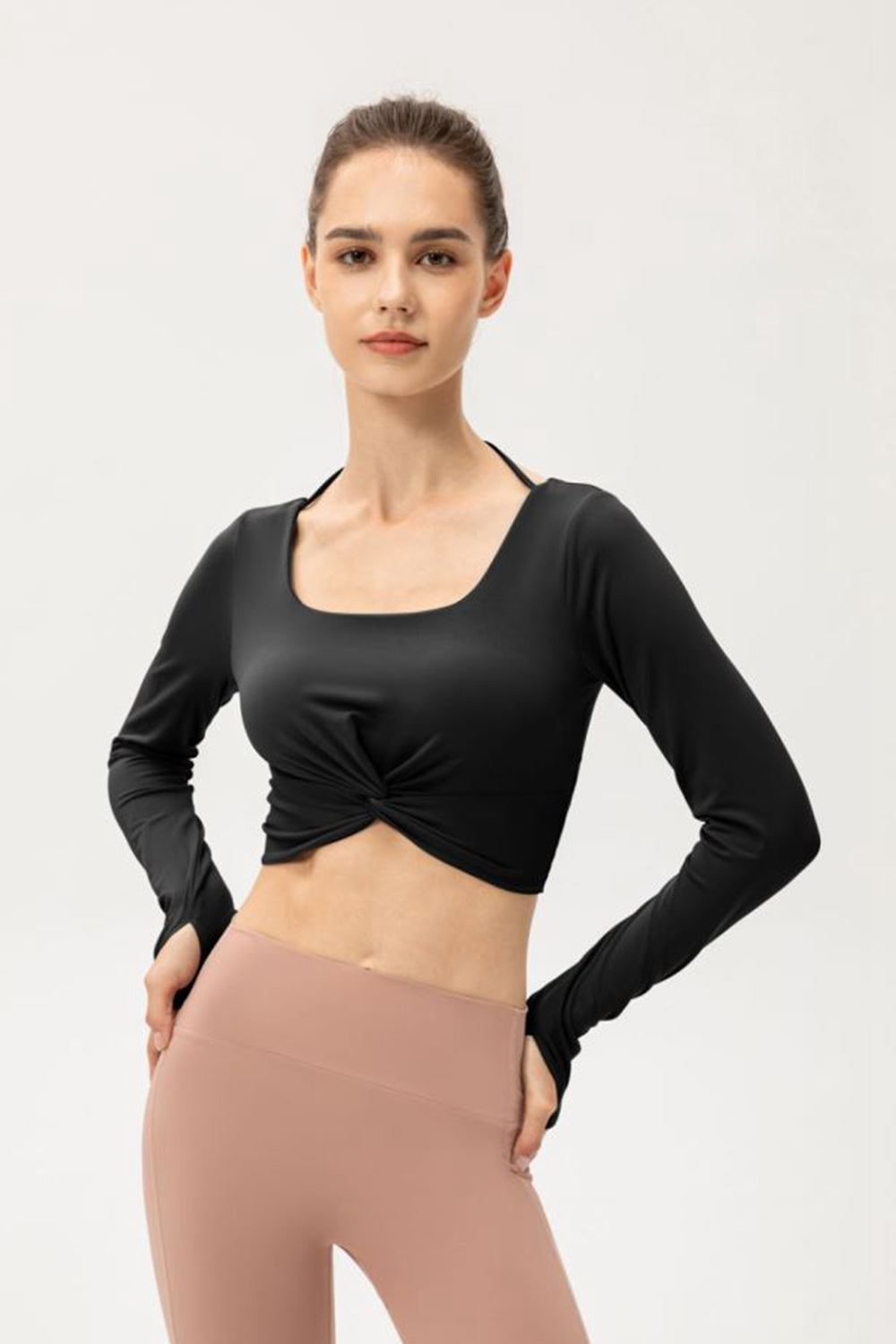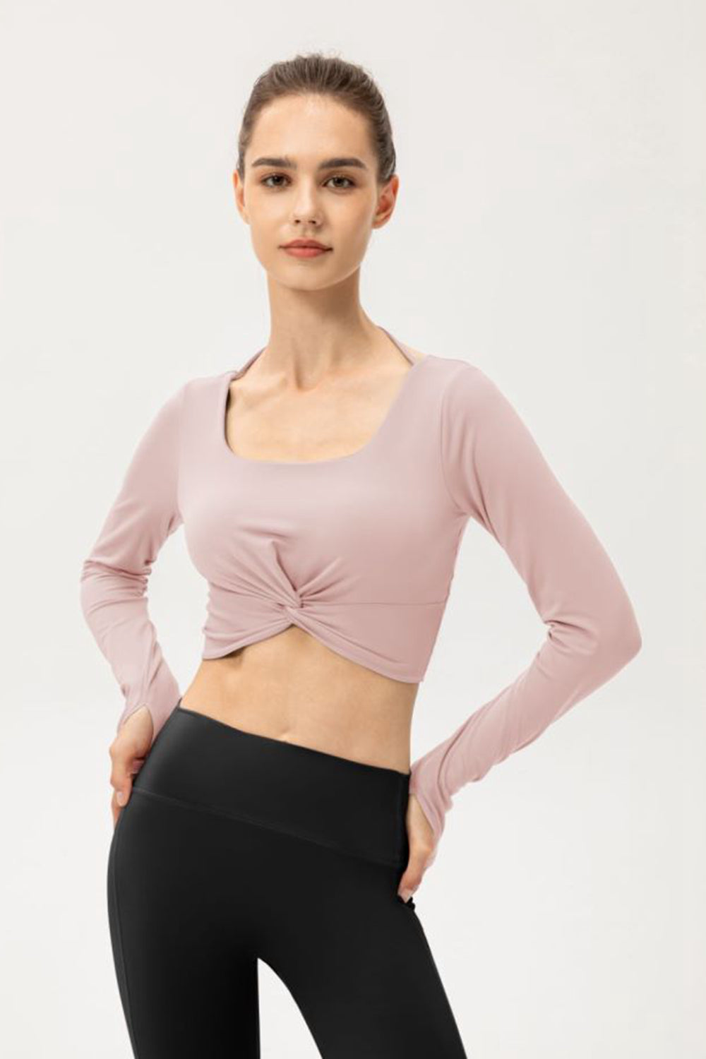 Twist Front Square Neck Long Sleeve Cropped Sports Top